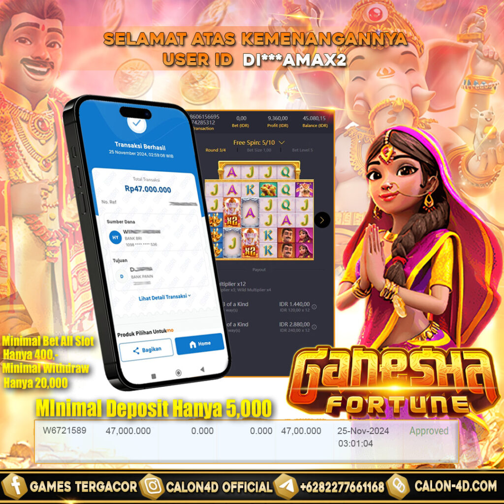 Selamat Kepada User ID DI***AMAX2 mendapatkan kemenangan besar pada permainan PG SOFT berada di rate tertinggi GANESHA FORTUNE kemenangan BESARNYA 47 JUTA DI CALON4D Sekali lagi selamat kepada member setia kami dan juga sudah mempercayakan situs kami, CALON4DWD Berapapun pasti dibayar TUNTAS !!FB : Games TergacorTelegram : Calon4dKETIK DI GOOGLE CALON4D
