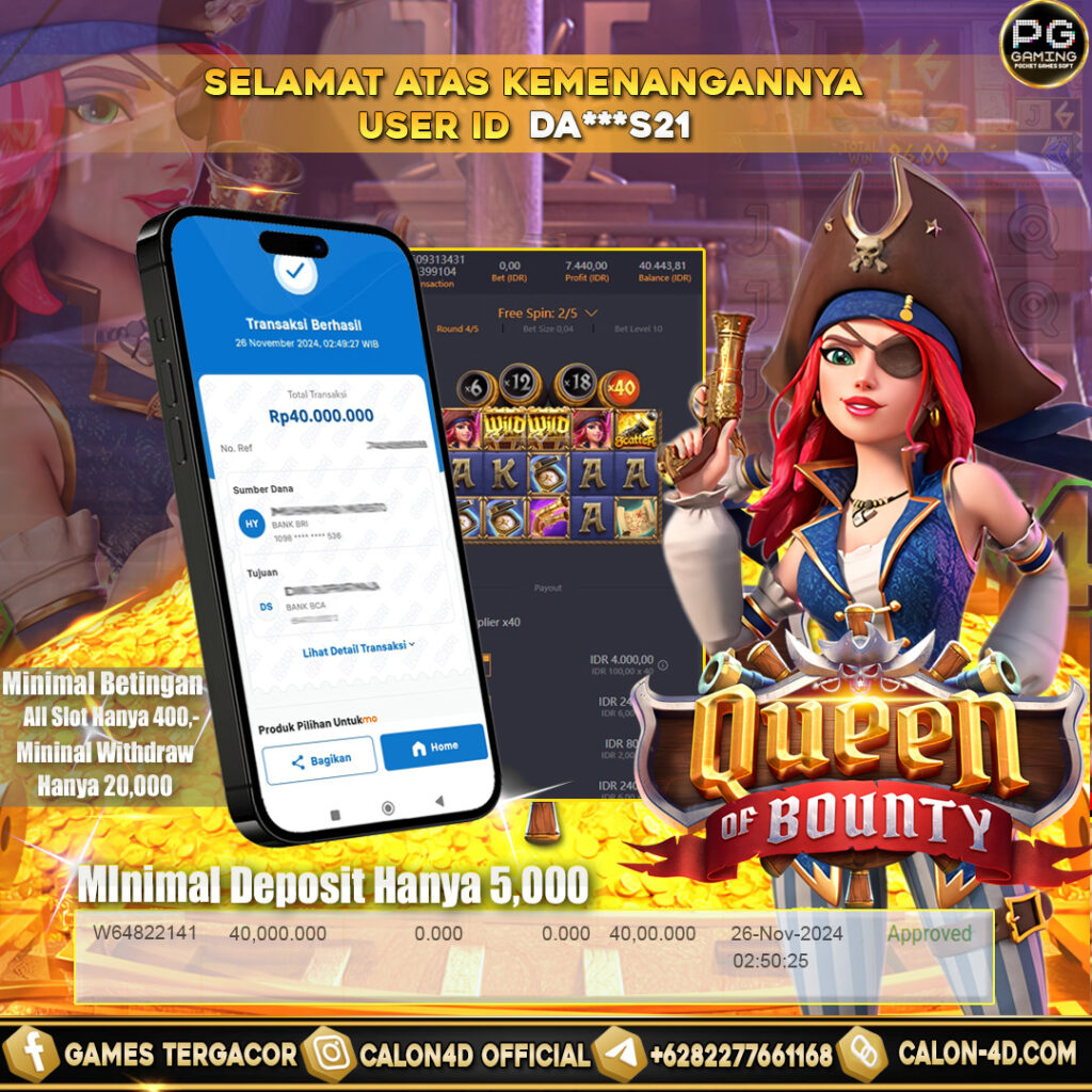 Selamat Kepada User ID DA***S21 mendapatkan kemenangan besar pada permainan PG SOFT berada di rate tertinggi QUEEN OF BOUNTY kemenangan BESARNYA 40 JUTA DI CALON4D Sekali lagi selamat kepada member setia kami dan juga sudah mempercayakan situs kami, CALON4DWD Berapapun pasti dibayar TUNTAS !!FB : Games TergacorTelegram : Calon4dKETIK DI GOOGLE CALON4D