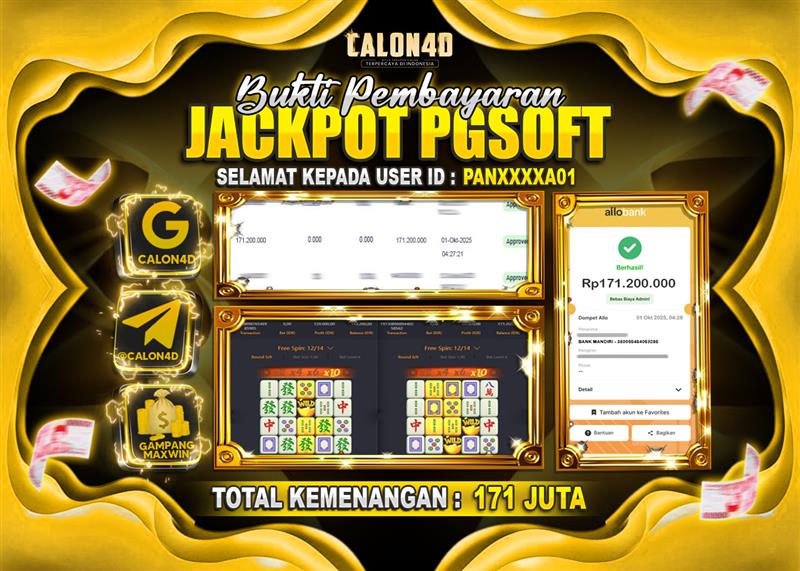 Selamat Kepada user ID PANXXXXA01 mendapatkan kemenangan besar pada permainan PG SOFT berada di rate tertinggi Mahjong Ways kemenangan BESARNYA 171 JUTA DI CALON4D Sekali lagi selamat kepada member setia kami dan juga sudah mempercayakan situs kami, CALON4D