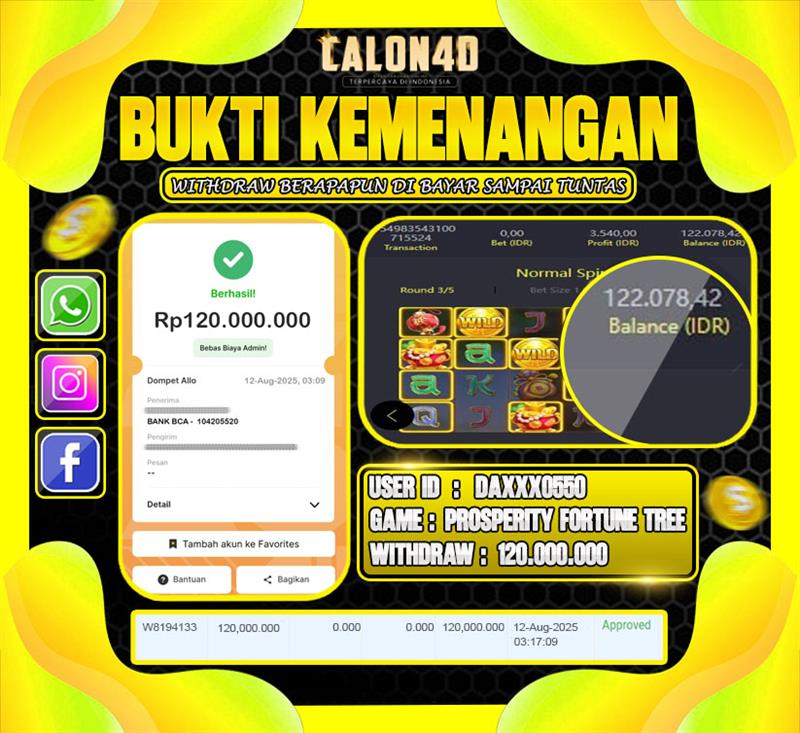 Selamat Kepada user ID DAXXX0550 mendapatkan kemenangan besar pada permainan PG SOFT berada di Prosperity Fortune Tree kemenangan BESARNYA 120 JUTA DI CALON4D Sekali lagi selamat kepada member setia kami dan juga sudah mempercayakan situs kami, CALON4D