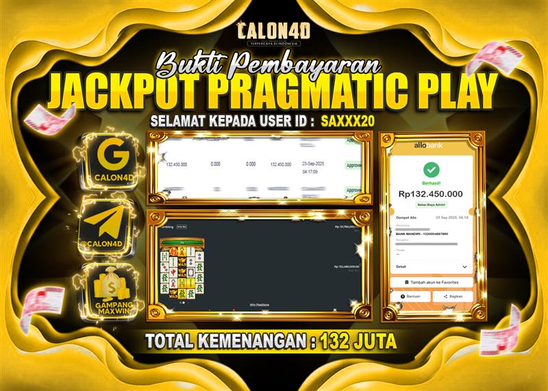Selamat Kepada user ID SAXXX20 mendapatkan kemenangan besar pada permainan PRAGMATIC PLAY berada di rate tertinggi MAHJONG WINS 2 kemenangan BESARNYA 132 JUTA DI CALON4D Sekali lagi selamat kepada member setia kami dan juga sudah mempercayakan situs kami, CALON4D